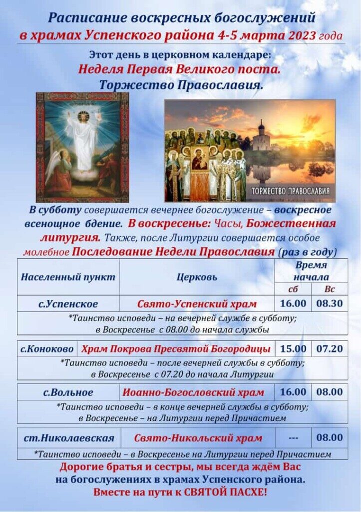 Расписание воскресных богослужений в храмах Успенского района 4-5 марта 2023 года (8) Поделиться:TwitterВКонтактеОдноклассникиGoogle
